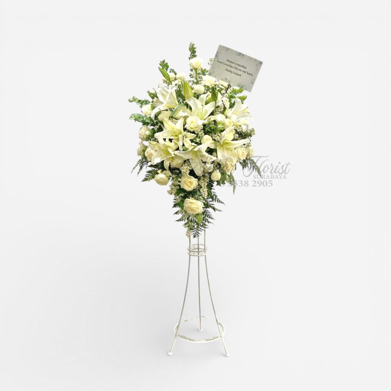 Hadirkan ketenangan di tengah duka. Percayakan pengiriman standing flower nuansa putih elegan ini kepada kami.